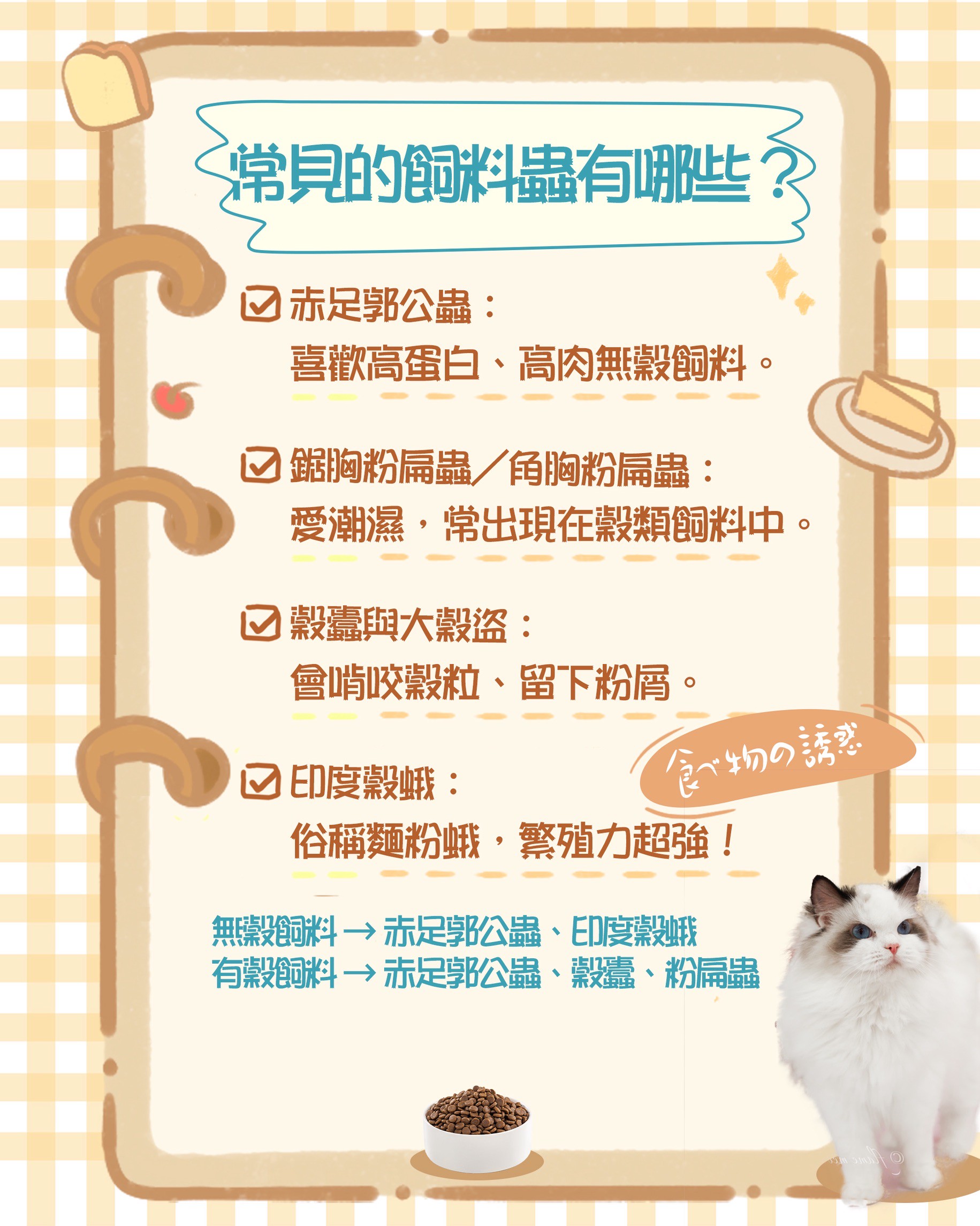 有穀飼料 → 赤足郭公蟲、穀蠹、粉扁蟲